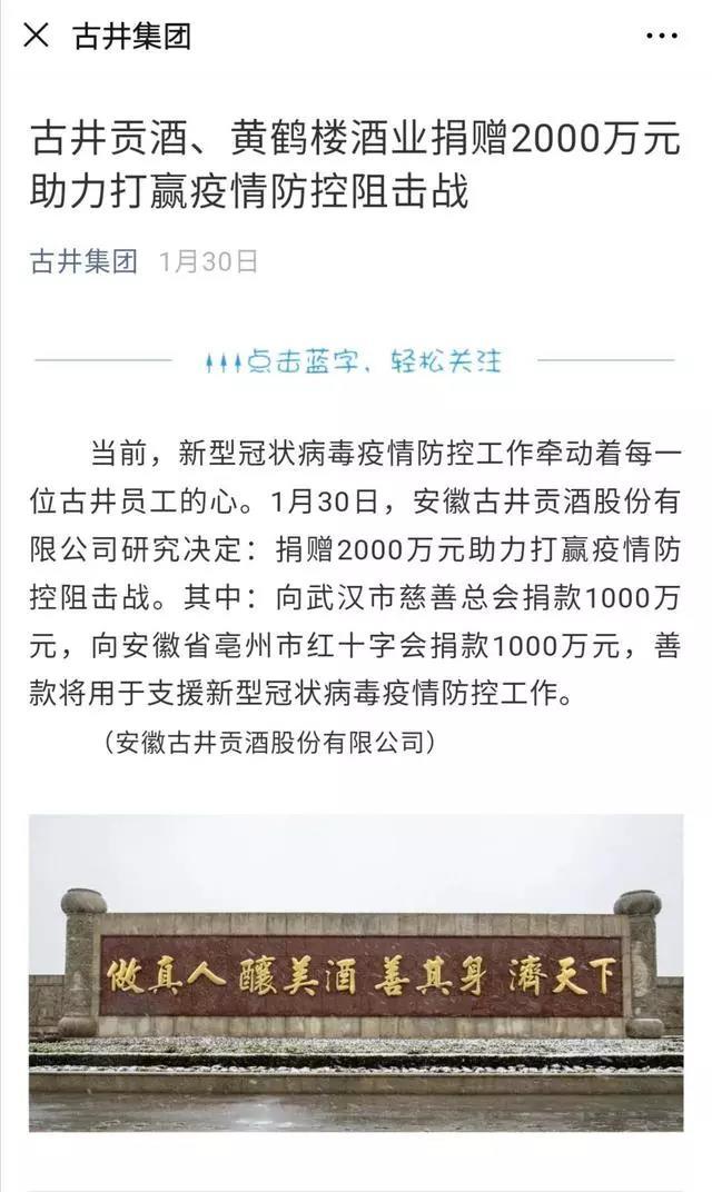這源于1月30日古井集團(tuán)官方微信發(fā)布的一條簡(jiǎn)訊:安徽古井貢酒股份有限公司研究決定,捐贈(zèng)2000萬元助力打贏疫情防控阻擊戰(zhàn)。其中,向武漢市慈善總會(huì)捐款1000萬元,向安徽省亳州市紅十字會(huì)捐款1000萬元,善款將用于支援新型冠狀病毒疫情防控工作。