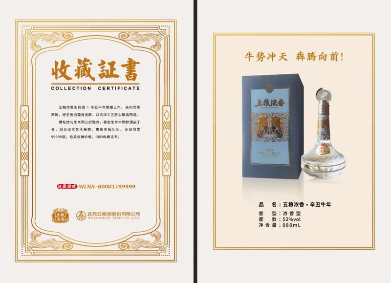 與常規(guī)產(chǎn)品不同,這款產(chǎn)品采用888ml大容量包裝,每箱4瓶。為凸顯稀缺尊貴,產(chǎn)品采用絕版設(shè)計(jì),即一輪投放結(jié)束后,下一輪重新設(shè)計(jì)。五糧濃香·辛丑牛年生肖酒限量發(fā)行99999瓶。同時(shí),為了彰顯產(chǎn)品收藏屬性,每瓶酒都內(nèi)附收藏證及編號(hào),具備極高的收藏和保值、增值潛力。Content 2?